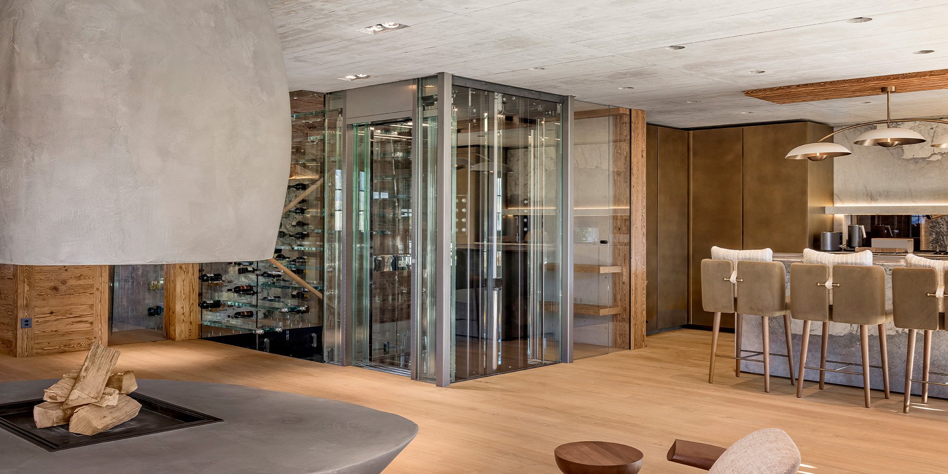 Dans un chalet en bois ancien soigneusement rénové, un ascenseur design hydraulique relie trois niveaux – du hall d’entrée aux espaces de vie, jusqu’aux zones de retrait privées. La gaine d’ascenseur entièrement vitrée, sur toute la hauteur, entre en dialogue volontaire avec l’escalier également transparent, créant une atmosphère ouverte et baignée de lumière qui prolonge avec cohérence le concept architectural global.