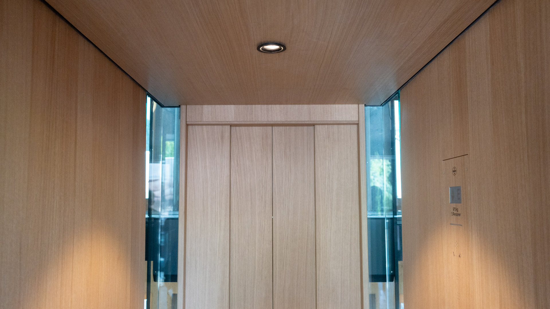 Die Kabine überzeugt durch Echtholzfurnier, Glasecken und einer präzise geführten LED-Lichtlinie, die den Raum subtil akzentuiert. Der verglaste Schacht erlaubt Einblicke in die sichtbare Technik – Kabelführungen, Führungsschienen und das schwarz lackierte Gegengewicht werden Teil der architektonischen Inszenierung. Mit acht Haltestellen und einer Nutzlast von 975 kg gewährleistet die Anlage eine komfortable, barrierefreie Erschliessung – ein Beispiel für die gelungene Verbindung von Funktion, Designqualität und gepflegtem Handwerk.